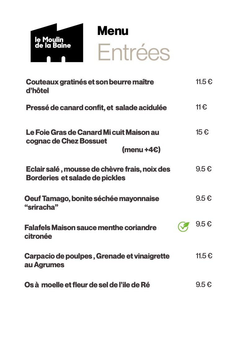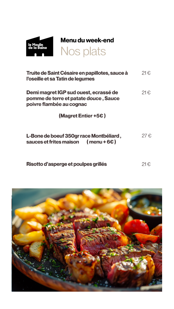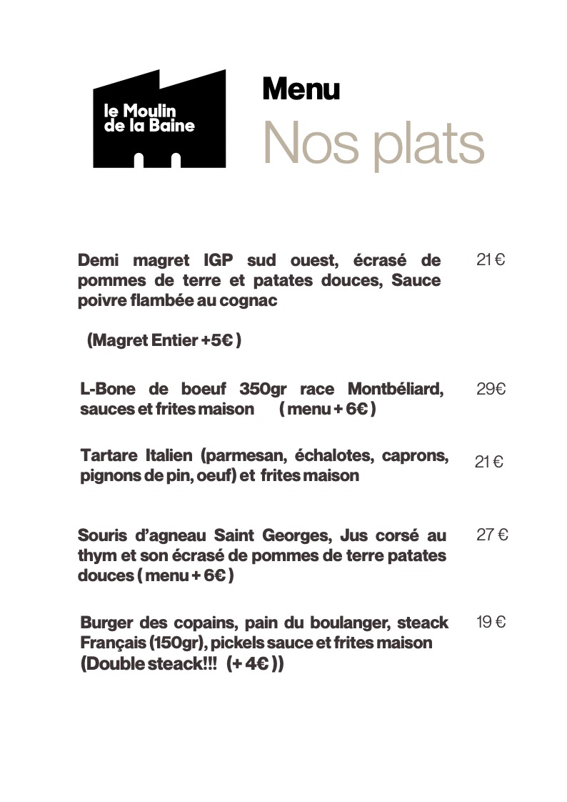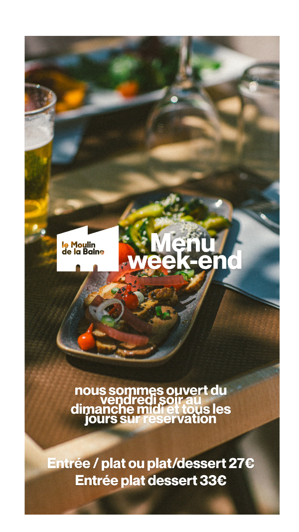 Le Restaurant Le Moulin de la Baine tous les jours, du mardi au jeudi (le midi uniquement jusqu’à fin avril), les vendredis et samedis (midi et soir), ainsi que le dimanche midi (fermeture le lundi et le dimanche soir),