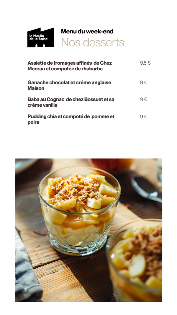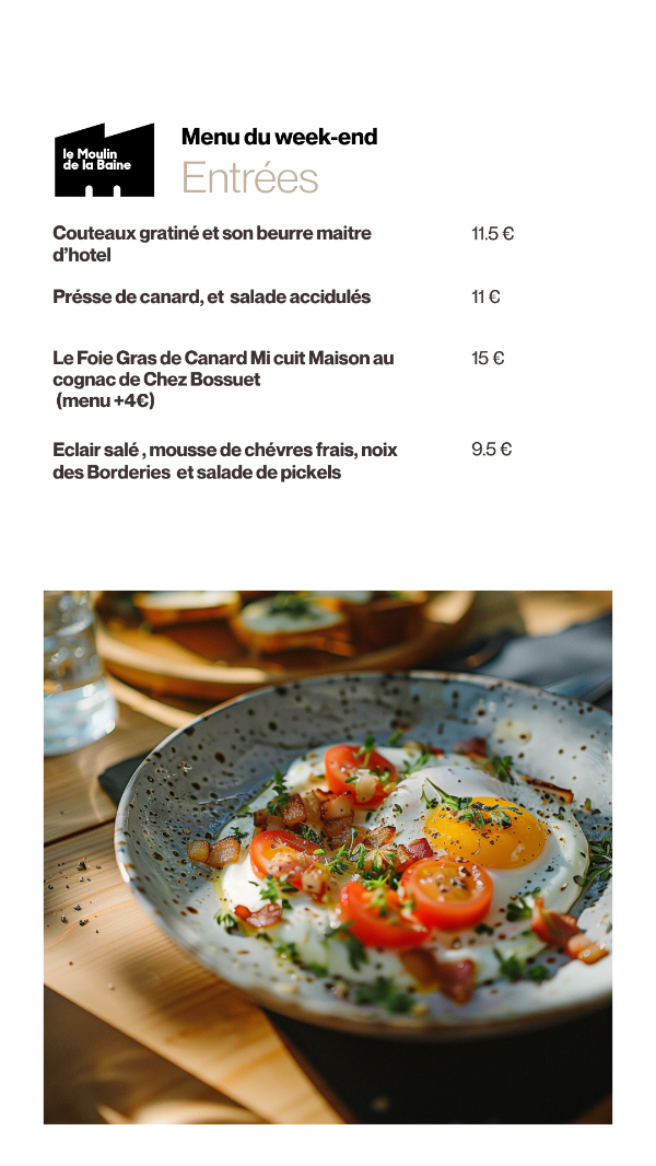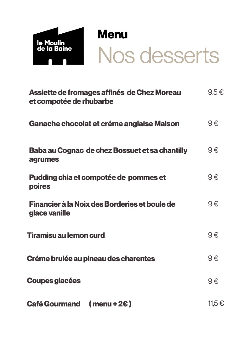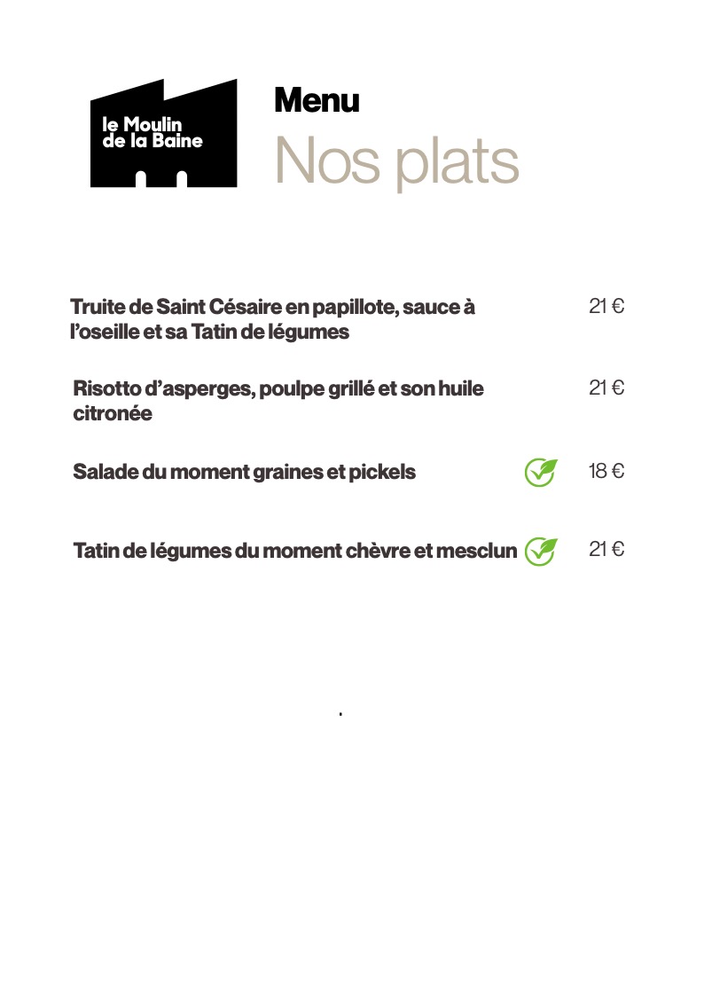 Le Restaurant Le Moulin de la Baine tous les jours, du mardi au jeudi (le midi uniquement jusqu’à fin avril), les vendredis et samedis (midi et soir), ainsi que le dimanche midi (fermeture le lundi et le dimanche soir),