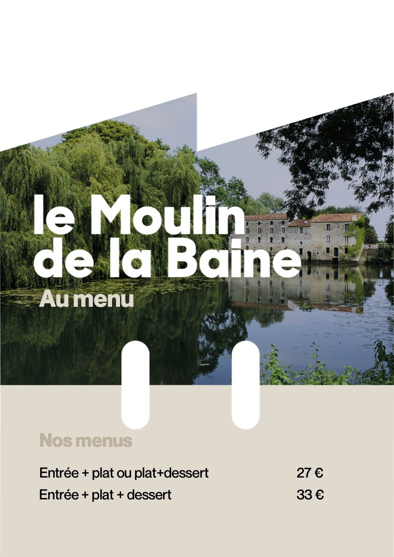 Situé à Chaniers, au coeur de la Saintonge Romane, le Moulin de la Baine bénéficie d’un cadre authentique et préservé, d’une végétation luxuriante dès les beaux jours, d’une terrasse panoramique surplombant la Charente et de 3 salles de restaurant.