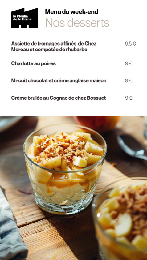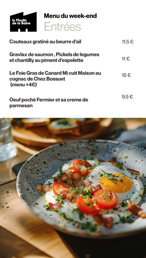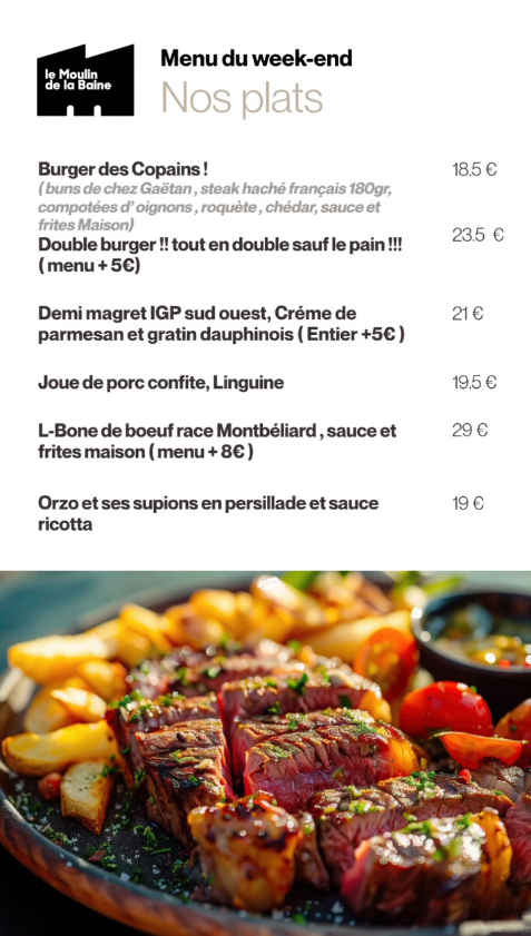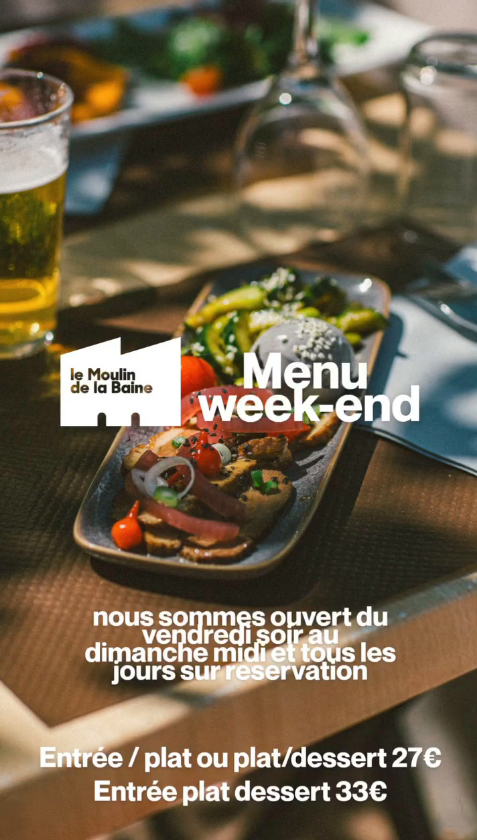 Le restaurant Le Moulin de la Baine est actuellement ouvert du vendredi soir au dimanche midi et tous les jours sur demande pour les groupes : nous contacter.